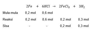 Sebanyak 11,2 gram logam besi direaksikan dengan 21,9 gram asam klorida dalam persamaan reaksi: