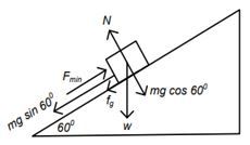 Sebuah balok berada pada suatu bidang miring dengan elevasi 60°. Massa balok itu 1 kg dan percepatan gravitasi setempat 10 . Gaya minimum untuk mendorong balok itu menyusur bidang ke atas sebesar 10 N. Koefisien gesek kinetik yang mungkin antara balok dan bidang miring adalah ....