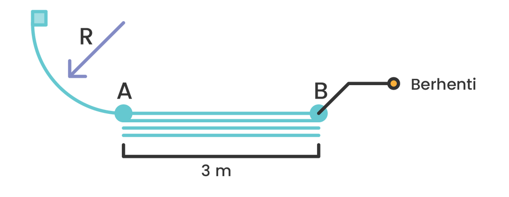 Sebuah balok bermassa 2 kg mula-mula diam dilepaskan dari puncak bidang lengkung yang berbentuk seperempat lingkaran dengan jejari R. Kemudian balok meluncur pada bidang datar dan berhenti di B yang berjarak 3 m dari titik awal bidang datar A. Jika bidang lengkung tersebut licin sedangkan gaya gesek antara balok dan bidang datar sebesar 8 N, maka R adalah