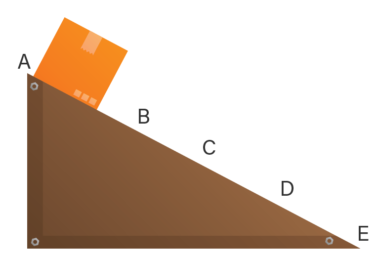 Sebuah balok dilepas tanpa kecepatan awal di puncak bidang miring licin (di A). Balok meluncur hingga dasar bidang miring (di E).