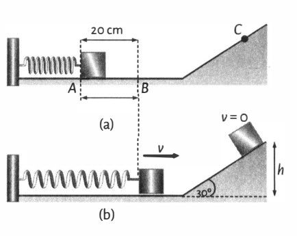 Sebuah balok memiliki massa 3 kg, didorongkan pada pegas yang memiliki konstanta 600 N/m sehingga pegas tertekan 20 cm. Kemudian, balok dilepas dan pegas mendorong balok hingga bergerak sepanjang permukaan licin dan kemudian menaiki sebuah bidang miring licin bersudut 300 seperti ditunjukkan gambar.