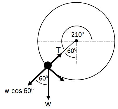 Sebuah bandul massanya 0,4 kg diikatkan pada seutas tali yang panjangnya 50 cm (massa tali diabaikan) kemudian diputar sehingga melakukan gerak melingkar beraturan dalam bidang vertikal. Jika pada saat bandul mencapai suatu titik A yang membentuk sudut sebesar 210 terhadap arah sumbu-x positif kecepatannya 5 m/s, maka besar tegangan tali pada posisi tersebut adalah ….