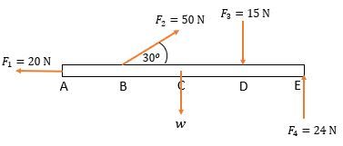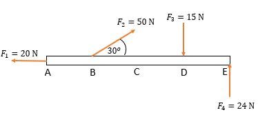 Sebuah batang dengan massa 4 kg diberikan beberapa gaya seperti gambar di bawah ini.