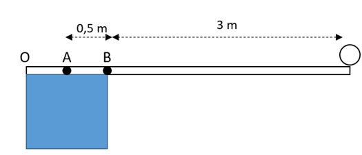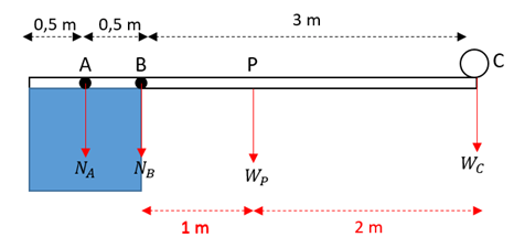 Sebuah batang kayu homogen sepanjang 4 m bermassa 50 kg dijadikan papan peloncat untuk perenang. Papan ditahan pada titik A dan B yang berjarak 0,5 m seperti gambar berikut.