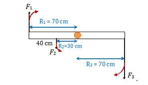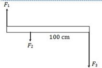 Sebuah batang yang sangat ringan panjangnya 140 cm. Pada batang bekerja tiga gaya masing-masing F1 = 20 N, F2 = 10 N, dan F3 = 40 N dengan arah dan posisi seperti pada gambar.
