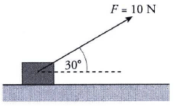 Sebuah benda bermassa 1 kg terletak diam di atas bidang datar yang licin. Kemudian pada benda bekerja gaya F = 10 N yang membentuk sudut 30° terhadap horizontal seperti pada gambar. Jarak yang ditempuh benda dalam waktu 10 detik adalah ....