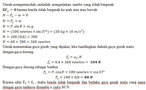Sebuah benda bermassa 20 kg didorong di atas bidang kasar dengan arah gaya seperti berikut.