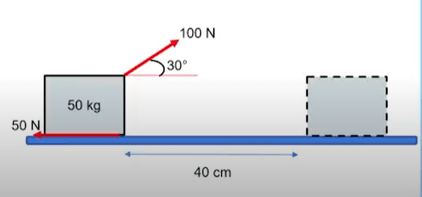 Sebuah benda dengan massa 50 kg ditarik sejauh 40 cm sepanjang lantai Horizontal dengan gaya tetap 100 N dan membentuk sudut 30° terhadap arah mendatar. Jika gaya gesek terhadap lantai 50 N, tentukan usaha yang dilakukan oleh masing - masing gaya.