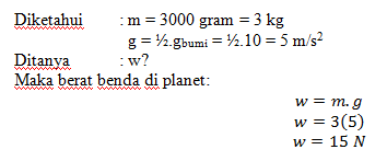 Sebuah benda ditimbang di bumi memiliki massa 3000 gram, kemudian benda itu dibawa ke suatu planet yang memiliki percepatan gravitasi ½ kali gravitasi di bumi. Berat benda di planet tersebut adalah .…