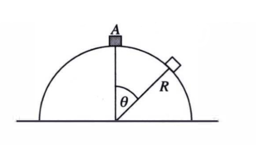 Sebuah benda kecil A mulai meluncur dari puncak sebuah bola licin dengan radius R. Tentukan sudut saat benda tepat meninggalkan bola dan kecepatan benda saat meninggalkan bola (nyatakan dalam g dan R) jika g dan R = 0,3 m.