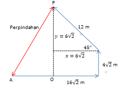 Sebuah benda melakukan perjalanan. Mula - mula benda bergerak ke timur , kemudian ke utara sejauh , dan berbelok ke arah barat sejauh 12 m. Besar resultan pejalanan benda tersebut adalah...