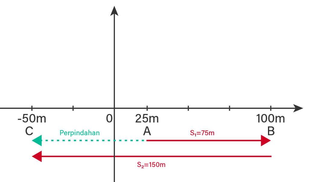 Sebuah benda semula berada di titik A yang berada 25 m di sebelah kanan titik O ( 0 m ), kemudian bergerak ke titik B yang berada 100 m di sebelah kanan titik O, kemudian berbalik arah bergerak ke titik C yang terletak pada kedudukan 50 m di kiri titik O. Bila waktu yang diperlukan seluruhnya 30 detik, berapa kecepatannya?