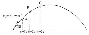 Sebuah bola dilempar dengan sudut elevasi menempuh lintasan parabola seperti terlihat pada gambar. Percepatan gravitasi , maka perbandingan kecepatan di titik A, B, dan C adalah ....