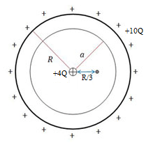 Sebuah bola konduktor dengan jari-jari R memiliki rongga berbentuk bola yang berjari-jari a dihitung dari pusat konduktor, dengan a > R. Di pusat bola konduktor diletakkan sebuah muatan titik +4Q dan kulit bola konduktor itu diberi muatan +10Q. Jika k = dengan adalah permitivitas listrik dalam udara, maka besar kuat medan listrik di sebuah titik yang berjarak R dari pusat bola konduktor adalah … .