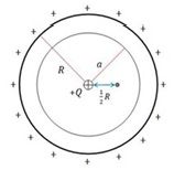 Sebuah bola konduktor dengan jari-jari R memiliki rongga berbentuk bola yang berjari-jari dihitung dari pusat bola konduktor, dengan . Di pusat bola konduktor diletakkan sebuah muatan titik +Q dan bola konduktor itu diberi muatan +Q. Jika dengan adalah permitivitas listrik dalam udara, maka besar kuat medan listrik di sebuah titik yang berjarak dari pusat bola konduktor adalah …