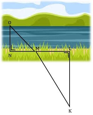 Sebuah jembatan akan dibuat untuk menyebangi sungai. Untuk mengukur lebar sungai tanpa harus menyebranginya, seorang pekerja meletakkan beberapa patok kayu yang diberi tanda huruf K, L, M, N dan O seperti gambar di bawah ini.