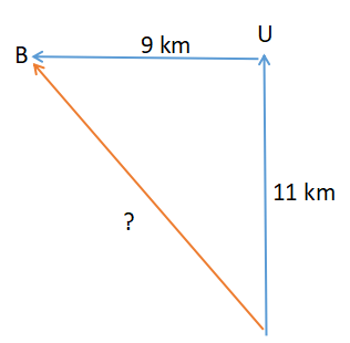 Sebuah kapal berlayar kearah utara sejauh 11 km. Kemudian kapal tersebut berbelok kearah barat sejauh 9 km. Hitunglah jarak terdekat dari titik keberangkatan hingga ke titik akhir!
