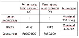 Sebuah kapal dapat menampung 200 penumpang. Penumpang kelas eksekutif dapat membawa 20 kg bagasi dan penumpang kelas ekonomi dapat membawa 10 kg bagasi. Kapal tersebut hanya dapat membawa 3.000 kg bagasi. Jika keuntungan dari penjualan satu tiket kelas eksekutif adalah Rp100.000 dan kelas ekonomi Rp50.000, maka keuntungan maksimum yang dapat diperoleh dari penjualan tiket adalah ....