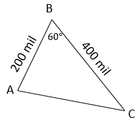 Sebuah kapal mulai bergerak dari pelabuhan A pada pukul 07.00 dengan arah 030° dan tiba di pelabuhan B setelah 4 jam bergerak. Pukul 12.00 kapal bergerak kembali dari pelabuhan B menuju pelabuhan C dengan memutar haluan 150° dan tiba di pelabuhan C pukul 20.00. Kecepatan rata-rata kapal 50 mil/jam. Jarak tempuh kapal dari pelabuhan C ke pelabuhan A adalah ....