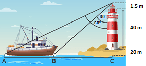 Sebuah kapal sedang berlabuh di dermaga dengan posisi menghadap ke menara. Seorang pengamat yang berada di puncak menara melihat ujung depan kapal dengan sudut depresi derajat. Dan ujung belakang dengan sudut depresi derajat. Jika tinggi pengamat meter, tinggi menara meter dan tinggi dasar menara berada meter di atas permukaan laut, maka: