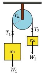 Sebuah katrol yang memiliki bentuk seperti silinder pejal homogen memiliki massa sebesar 2 kg dan diameter 50 cm. Katrol tersebut dihubungkan dengan dua buah beban seperti pada gambar.