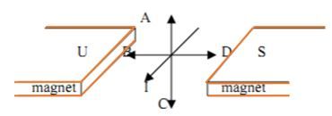 Sebuah kawat penghantar panjang terletak diantara kutub-kutub magnet dan dialiri arus sebesar I ampere. Arah gaya Lorentz yang dihasilkan adalah …