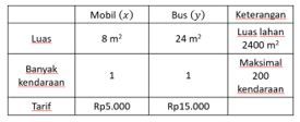 Sebuah lahan parkir seluas diperuntukkan untuk mobil dan bus serta memuat paling banyak 200 kendaraan. Luas untuk parkir satu mobil adalah dan untuk satu bus adalah . Jika tarif parkir mobil adalah Rp5.000 dan tarif parkir bus adalah Rp15.000, maka keuntungan maksimum yang dapat diperoleh petugas parkir pada saat lahan parkir tersebut penuh dalam satu waktu adalah ....