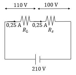 Sebuah lampu memiliki spesifikasi 27,5 W/110 V. Lampu tersebut dihubungkan dengan tegangan 210 V. Jika diinginkan agar lampu menyala dengan normal, pada rangkaian tersebut harus ditambahkan hambatan luar sebesar ….