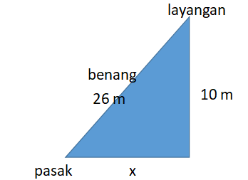 Sebuah layang-layang berada di ketinggian 10 meter dari permukaan tanah. Jika seutas tali yang memiliki panjang 26 meter menghubungkan layang-layang tersebut dengan pasak P di permukaan tanah, maka hitunglah jarak pasak dengan titik di permukaan tanah yang tepat berada di bawah layang-layang tersebut (rentang benang dianggap lurus).