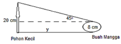 Sebuah mangga terjatuh di taman dekat kantor guru, tepat di depan tumbuhan kecil yang memiliki tinggi 20 cm, apabila sudut antara titik puncak buah mangga ke titik puncak tumbuhan kecil dengan arah mendatar adalah 450. Jika diameter buah mangga itu 8 cm, maka jarak antara buah mangga yang jatuh dengan tumbuhan kecil tersebut adalah ….