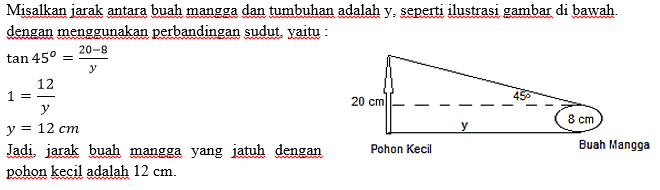 Sebuah mangga terjatuh di taman dekat kantor guru, tepat di depan tumbuhan kecil yang memiliki tinggi 20 cm, apabila sudut antara titik puncak buah mangga ke titik puncak tumbuhan kecil dengan arah mendatar adalah 450. Jika diameter buah mangga itu 8 cm, maka jarak antara buah mangga yang jatuh dengan tumbuhan kecil tersebut adalah ….