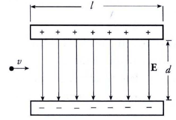 Sebuah medan listrik E yang homogen terbentuk di antara dua buah keping sepanjang l yang terpisah sejauh d seperti tampak dalam gambar. Sebuah elektron memasuki medan listrik tepat di pertengahan mulut kedua pelat dengan kelajuan horizontal v. Tentukan kelajuan minimal v agar elektron dapat melalui medan listrik tanpa menumbuk pelat! Abaikan gaya gravitasi.