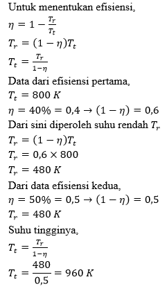 Sebuah mesin Carnot yang menggunakan reservoir suhu tinggi bersuhu 800 K mempunyai efisiensi sebesar 40%. Agar efisiensinya naik menjadi 50%, maka suhu reservoir suhu tinggi perlu dinaikkan menjadi ....