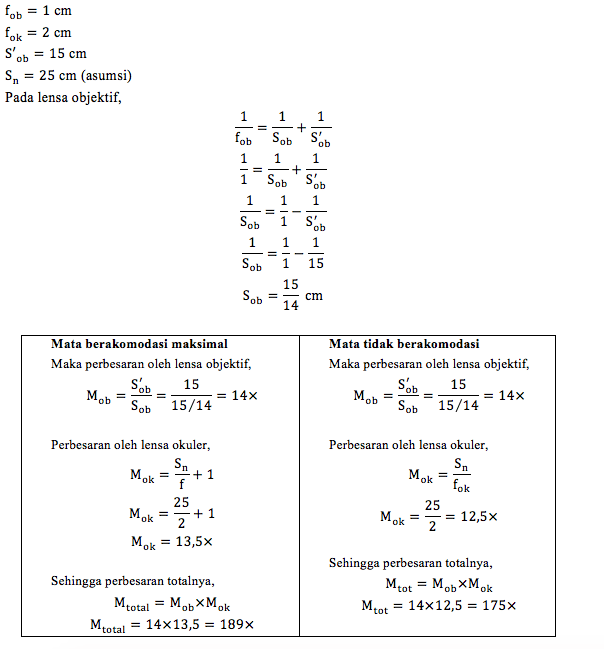 Sebuah mikroskop memiliki lensa objektif dan lensa okuler dengan fokus 1 cm dan 2 cm. Jika bayangan oleh lensa objektif berada pada jarak 15 cm dari lensa objektif. Perbesaran total saat mata berakomodasi maksimal dan mata tidak berakomodasi secara berturut-turut adalah ….