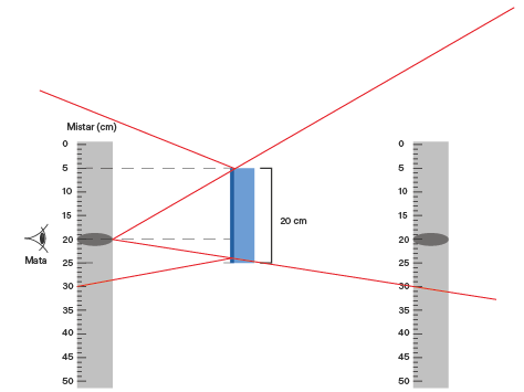 Sebuah mistar XY dengan panjang 50 cm memiliki satu lubang kecil pada tanda skala 20 cm, dipegang secara tegak seperti ditunjukkan pada gambar. Sebuah cermin datar diletakkan tegak di depan mistar. Seorang pengamat melihat melalui lubang ke cermin. Berapakah bayangan dari panjang mistar 50 cm yang dapat dilihat oleh pengamat di dalam cermin? Tunjukkan dengan melukis jalannya sinar.