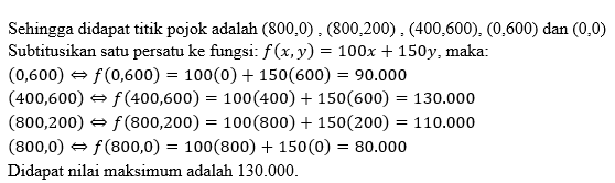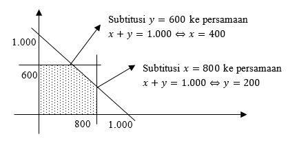 Sebuah pabrik memproduksi buku jenis polos dan bergaris. Dalam satu hari pabrik itu paling banyak memproduksi 1.000 buku. Dari bagian penjualan diperoleh keterangan bahwa tiap hari terjual tidak lebih dari 800 buku polos dan 600 buku bergaris. Keuntungan tiap buku jenis polos adalah Rp100,00 dan jenis bergaris adalah Rp150,00, maka keuntungan bersih sebesar – besarnya yang dapat diperoleh tiap hari adalah jika buku jenis polos ada sebanyak …