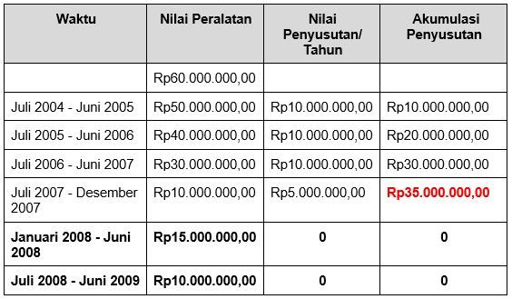 Sebuah peralatan dengan harga Rp60.000.000,00 dibeli pada tanggal 30 Juni 2004. Diperkirakan umur ekonomis peralatan tersebut adalah 5 tahun dengan nilai sisa Rp10.000.000,00. Pada tanggal 1 Januari 2008, peralatan tersebut dijual dan hanya dihargai Rp15.000.000,00. Bagaimanakah jurnal yang harus dibuat untuk mencatat transaksi tersebut? (Metode penyusutan yang digunakan adalah garis lurus)