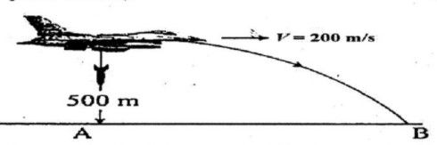 Sebuah pesawat tempur, terbang bergerak mendatar dan melepaskan bom (seperti pada gambar) Jika bom jatuh dititik B dan , maka jarak titik A ke B adalah...