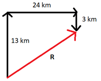 Sebuah pesawat terbang bergerak ke arah Utara sejauh 13 km kemudian berbelok ke arah Timur sejauh 24 km dan berbelok lagi ke arah Selatan sejauh 3 km. Perpindahan yang dialami pesawat terbang tersebut adalah ....