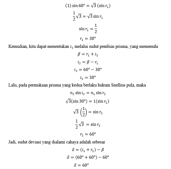 Sebuah prisma berlian memiliki sudut pembias 60o. Seberkas sinar datang dengan sudut 60o. Jika indeks bias prisma tersebut adalah , maka sudut deviasi yang dihasilkan karena prisma tersebut adalah sebesar ….