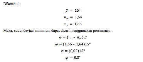 Sebuah prisma memiliki sudut pembias 15o. Ketika suatu cahaya putih datang pada prisma dengan sudut datang 12o, maka besarnya sudut dispersi antara sinar merah dan ungu sebesar .... (Diketahui indeks bias cahaya merah 1,64 dan indeks bias cahaya ungu sebesar 1,66)