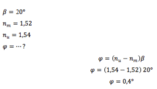 Sebuah prisma memiliki sudut pembias 20o. Indeks bias untuk sinar merah 1,52 dan untuk sinar ungu 1,54. Seberkas sinar putih jatuh pada salah satu sisi prisma. Apabila dianggap semua cahaya mengalami deviasi minimum, maka sudut dispersinya adalah ….