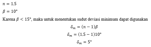 Sebuah prisma terbuat dari kaca dengan indeks bias sebesar 1,5. Jika sudut pembias prisma tersebut sebesar 10o, maka besarnya sudut deviasi minimum yang dihasilkan prisma adalah ….