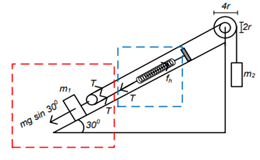 Sebuah sistem mekanik diperlihatkan pada gambar. Sudut kemiringan bidang dan bidang miring licin. Sistem berada dalam keadaan setimbang serta massa katrol dan massa pegas diabaikan. Jika setiap massa dijadikan dua kali semula, salah satu cara yang dapat dilakukan agar sistem tetap setimbang adalah ....