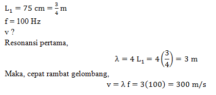 Sebuah sumber bunyi beresonansi pertama kali pada saat tinggi kolom udara 75 cm. Jika frekuensi sumber bunyi sebesar 100 Hz, maka cepat rambat bunyi dalam kolom udara sebesar .…
