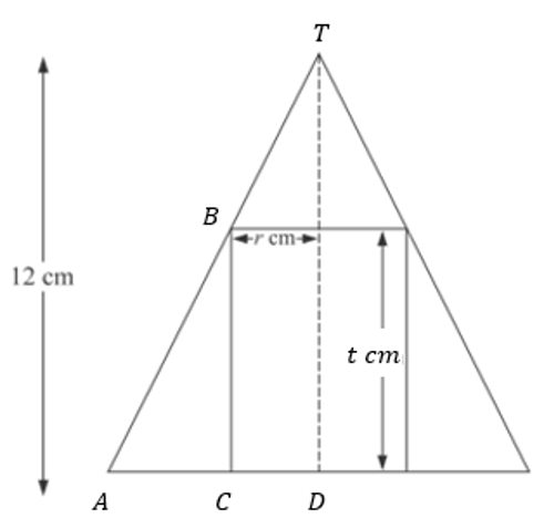 Sebuah tabung dimasukan ke dalam sebuah kerucut yang memiliki jari-jari 6 cm dan tinggi 12 cm. Jika diharapkan tabung yang terbentuk memiliki volume maksimum maka berapa jari-jari dan volume tabung berturut-turut seharusnya ….