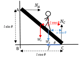 Sebuah tangga dengan panjang 5 m dan memiliki berat 100 N diletakkan bersandar pada dinding tembok vertikal dan membentuk sudut terhadap lantai. Jika dinding dianggap licin dan koefisien gesek antara lantai dan tangga adalah 0,5, jarak terjauh seorang dengan berat 500 N bisa memanjat tangga tepat sebelum tergelincir adalah ….