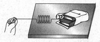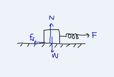 Sebuah tas yang berisi penuh dengan buku beratnya mencapai 52 N. Tas itu diletakkan di atas meja laboratorium. Sebuah pegas yang mempunyai konstanta pegas 150 N/m dikaitkan dengan tas (lihat gambar). Pegas ditarik secara horisontal dan memanjang sejauh 2 cm.
