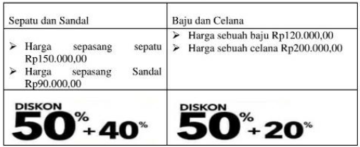 Sebuah toko memasang harga dan diskon sebagai berikut.