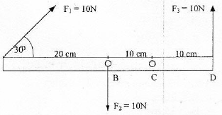 Sebuah tongkat yang panjangnya 40 cm mendapat tiga gaya seperti pada gambar. Jika tongkat diputar di titik C, maka momen gaya total adalah ....